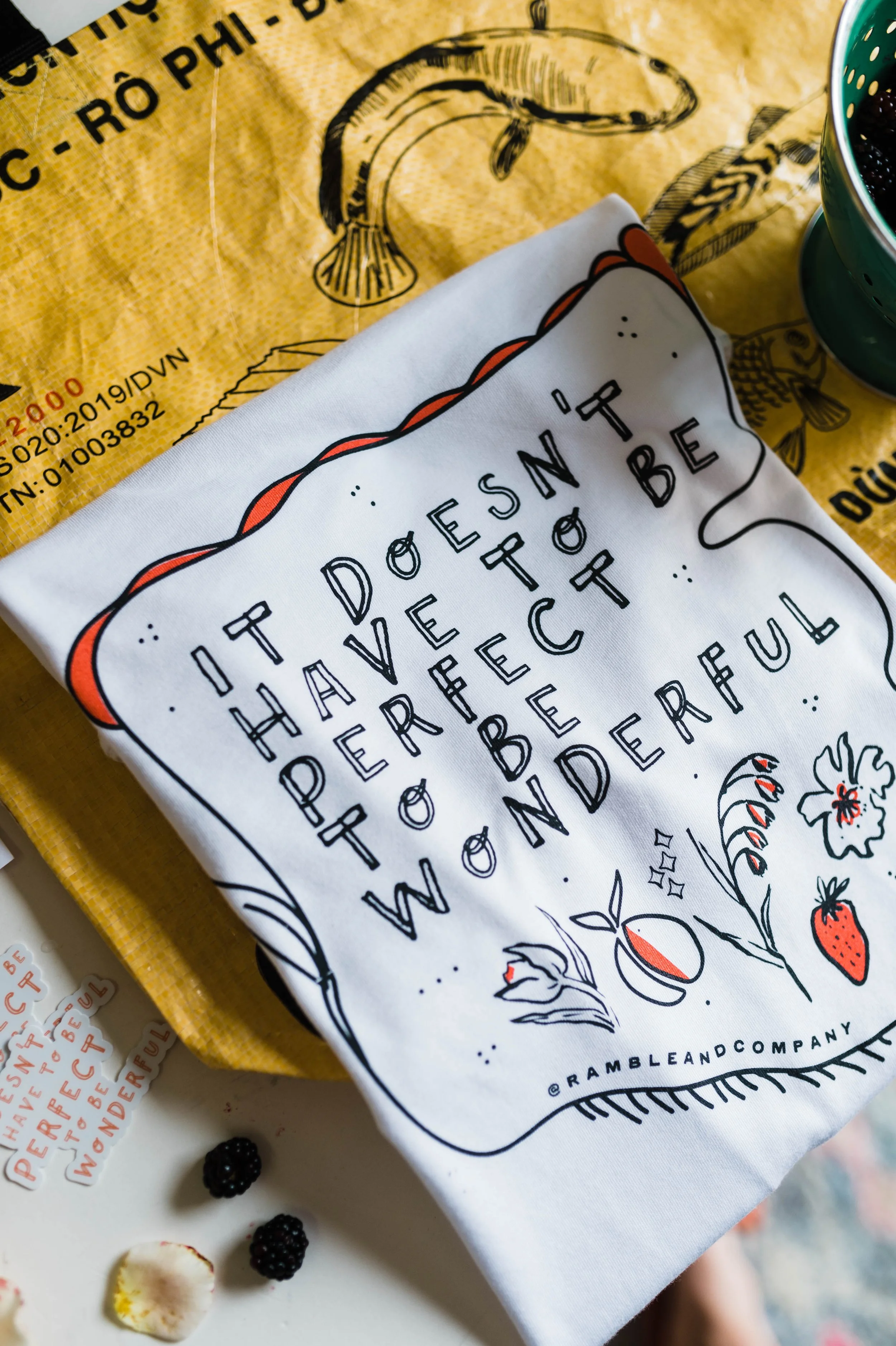 This bundle is revolving around this month's phrase: it doesn't have to be perfect to be wonderful. This phrase feels important to us because in this season we want to remind not only ourselves but you that life is beautiful + wonderful. The home garden with bug holes in most leaves/veggies/fruit, sun burned flower petals because you forgot to water, parenting, leading, work, home upkeep, etc. It's all hard and likely not perfect BUT IT DOESN'T MEAN IT ISN'T WONDERFUL!!! This design + tee is the reminder to keep going. Live to enjoy the moments, even when they don't seem perfect.